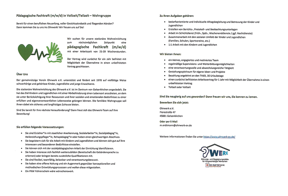 Download: Stellenangebot Pädagogische Fachkraft (m/w/d) in Vollzeit / Teilzeit - Wohngruppe (PDF)